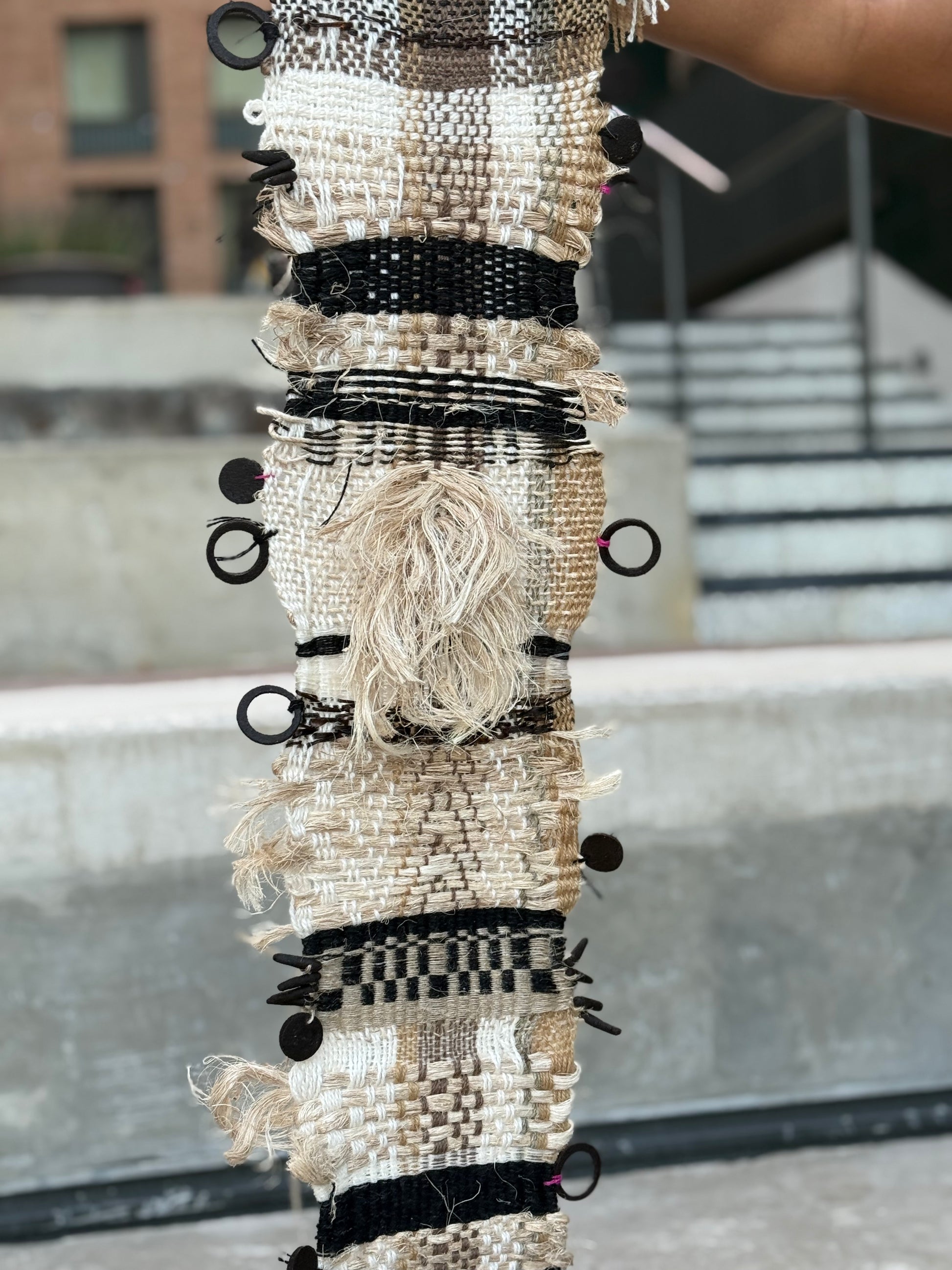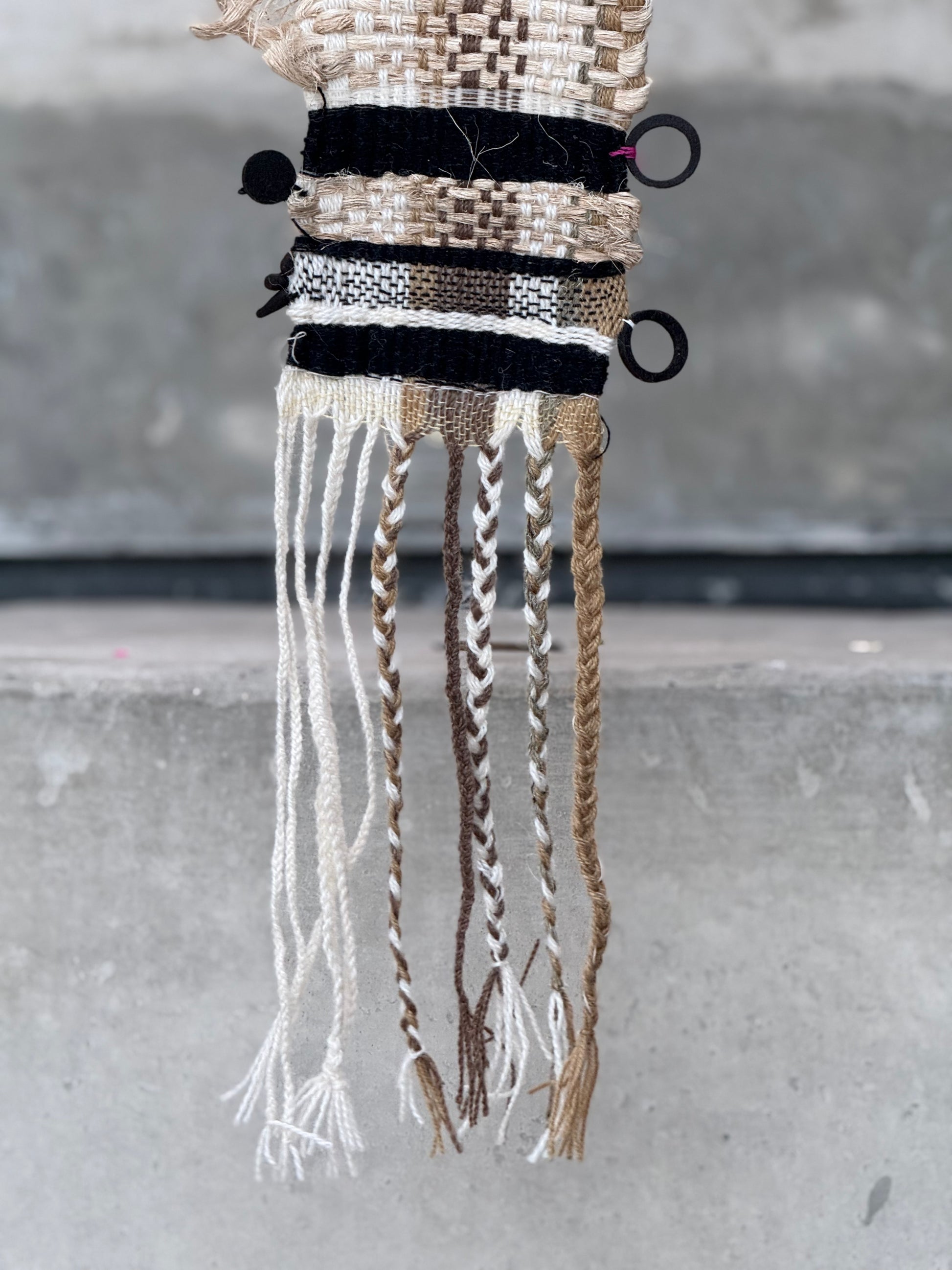 This is a hand-woven textile tapestry created using reclaimed Rug Yarn, Banana Fibre and kitchen waste from Local cafés and restaurants. It has elements made out of ground coffee and banana peels.